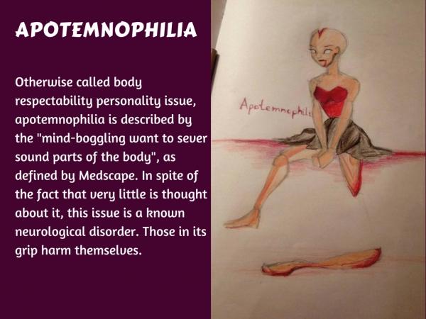Vücut bütünlüğüne ilişkin kimlik bozukluğu olarak da bilinen bu apotemnofili sendromu, kişinin herhangi bir uzvunu kendine ait hissetmemesi ve varlığından rahatsız olmasıdır. Kişiler bu uzuvların kendilerini çirkin veya engelli gibi gösterdiklerini düşünürler. Sendromun temeliyle ilgili belirsizlik hakim. Çocukluk dönemindeki travmaların, bir ampüte ile kendini fazlasıyla özdeşleştirmenin, obsesif bir eğilimin sebep olabileceğini düşünenler olduğu gibi beyindeki vücut algısının gerçekteki ile örtüşmemesinin bir getirisi olduğunu düşünenler de oldukça fazla. Bu sendromun görüldüğü kişiler, uzuvlarının nereden itibaren kendilerine ait olmadığını kesin bir çizgiyle belirtebilmektedir. Bir yolunu bulunca da bu uzvu kestirmekten çekinmemektedirler. Buna karşın etraflarındaki insanlarla bu problemi paylaşma hususunda ciddi sorunlar yaşamaktadırlar.